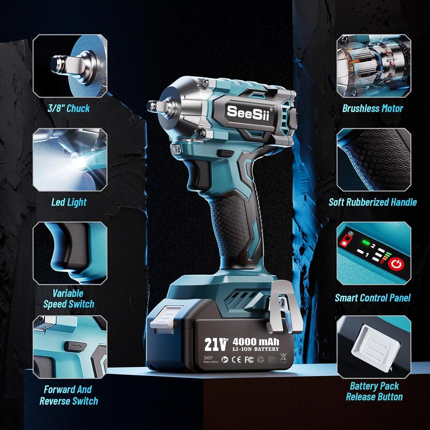 Seesii 3/8″ Cordless Impact Wrench, Power Impact Gun w/Max Torque 330Ft-lbs(450N.m), 4.0Ah Rechargable Battery & 4 Sockets, Compact Power Impact Wrench for Lightduty Work Car Home,WH450