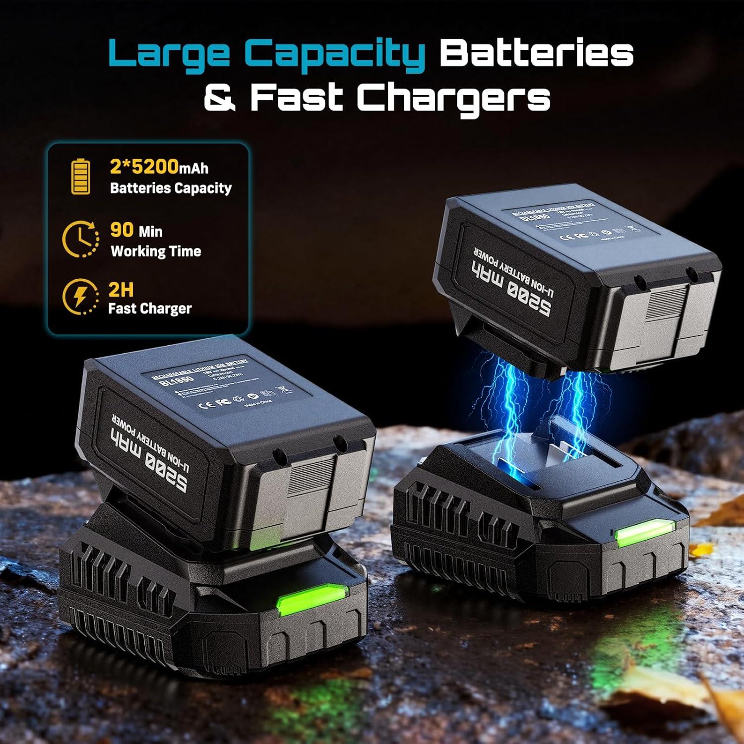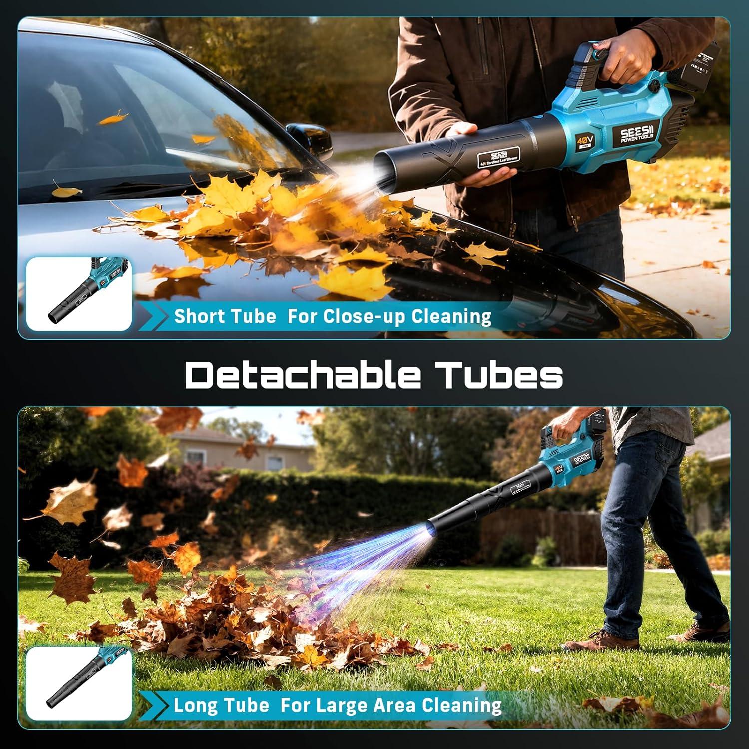 Extended Runtime: SEESII battery powered leaf blower equipped with two 5.2Ah batteries and two chargers, ensuring long-lasting power for your outdoor cleaning tasks. The dual battery setup provides up to 90 minutes of runtime on low settings, ideal for clearing large areas, driveways, and patios without frequent recharging.