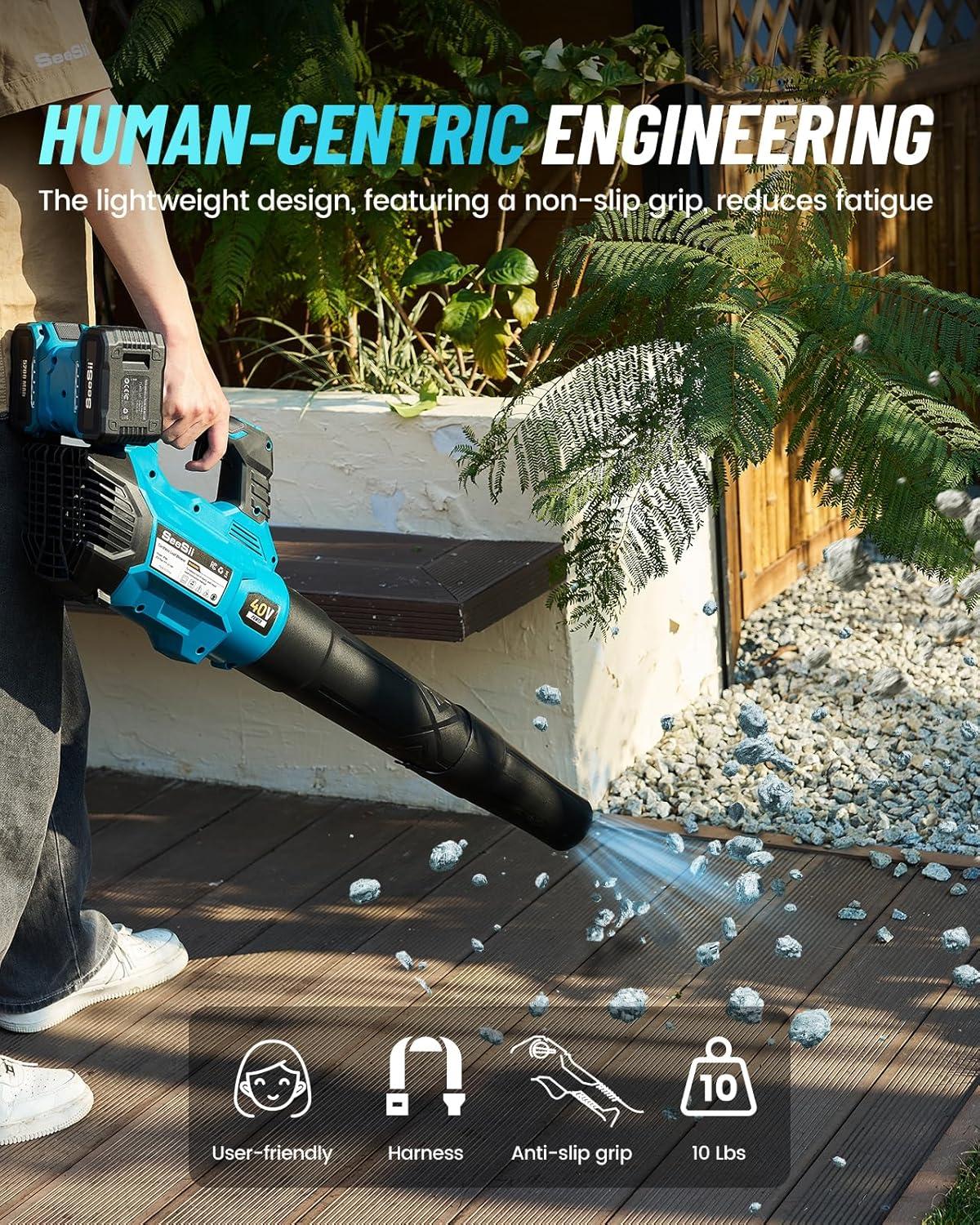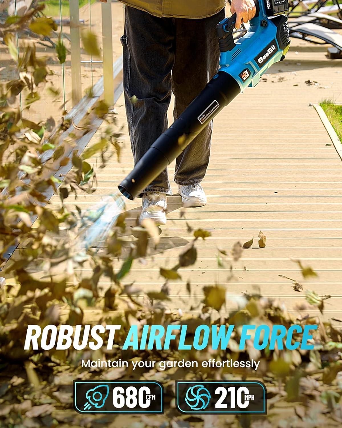 Powerful Airflow for Efficient Clearing: SEESII 40V leaf blower cordless is designed with up to 680 CFM and wind speeds of 210 MPH, the powerful airflow easily blows away heavy wet leaves, clears debris and dust from lawns, and even sweeps away small stones, making it ideal for tackling a wide range of outdoor cleaning tasks.