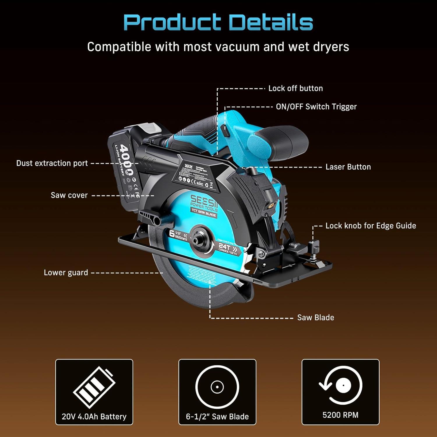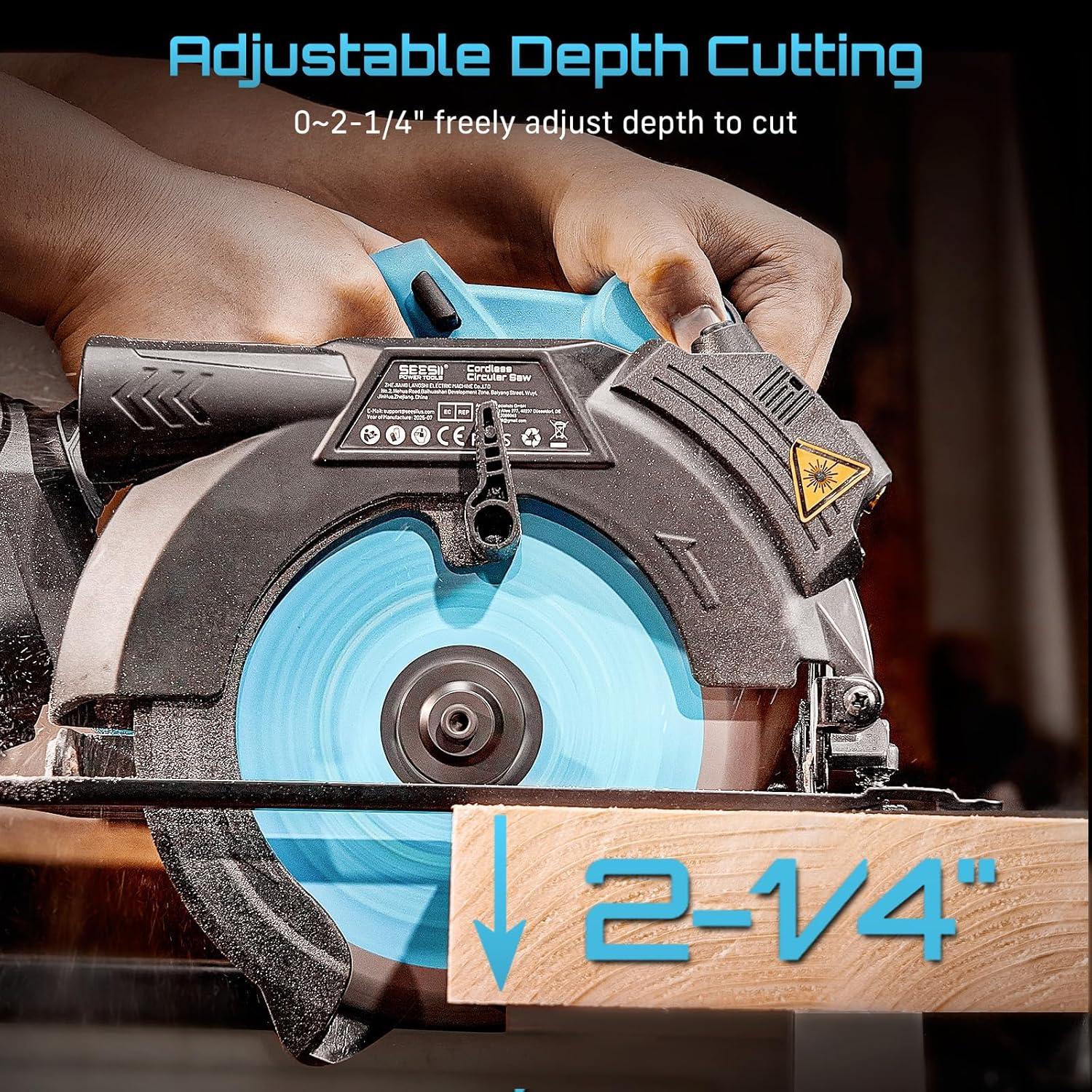 Seesii 6-1/2" Cordless Circular Saw with Battery and Charger,5200 RPM Electric Power Saw with Laser and Rip Guide for Precise Wood Cutting,Max Cut Depth 2-1/4"(90°),1-7/16" (45°) for Home Renovation(cordless circular saw)