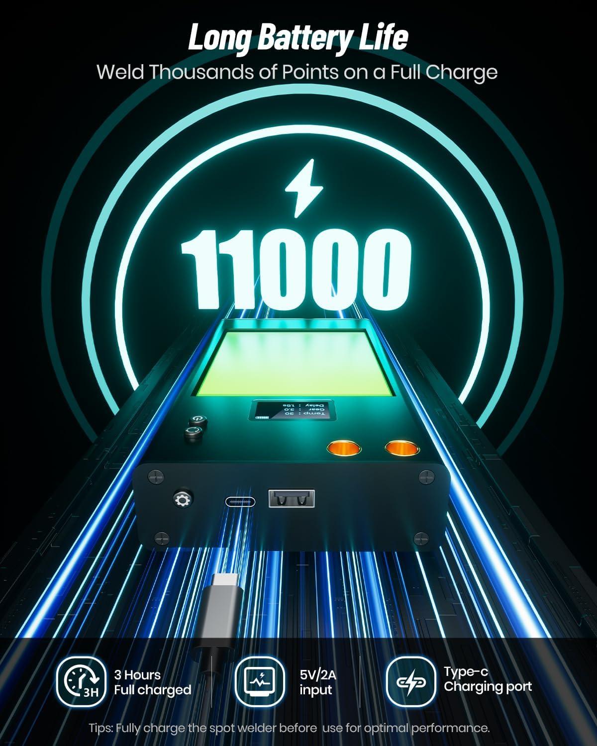 Upgraded Spot Welder: Features an 11000mAh battery and charging design; Fully charges in 3-5 hrs with Type-C cable; Welds thousands of points on a full charge; Uded for 0.1-0.15mm nickel sheets, ideal for battery packs (Note: Not for 0.2mm nickel strips)