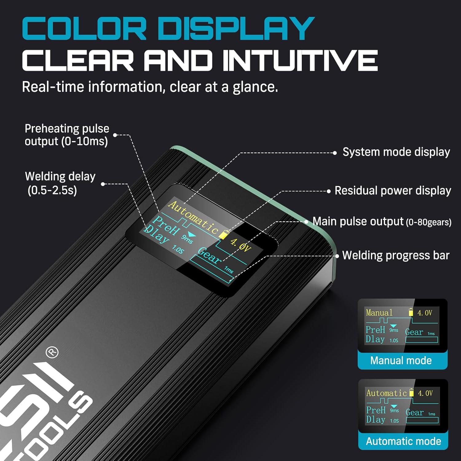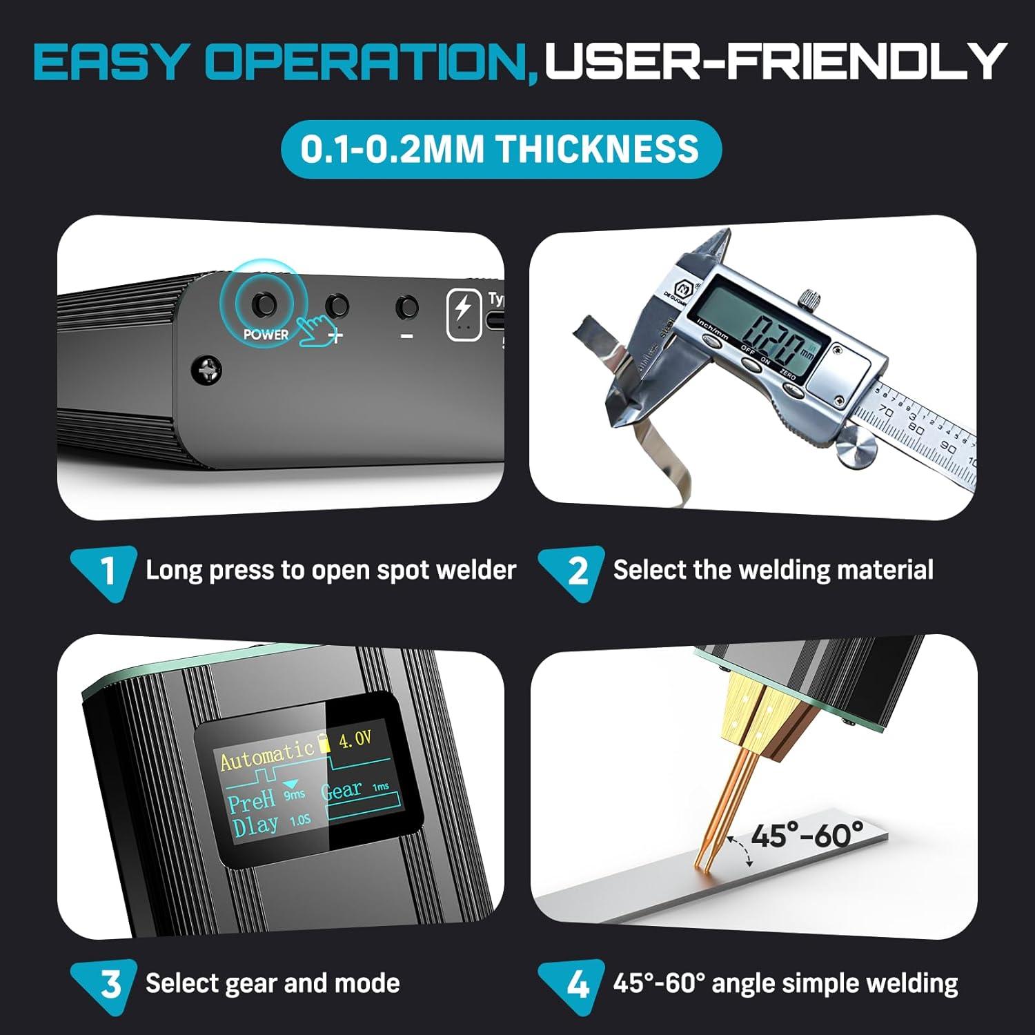 OLED Display with Integrated Safety Features: The SeeSii mini spot welder is equipped with an OLED screen that displays real-time parameters including mode, power level, preheat status, time delay, and welding progress; Built-in safeguards protect against overcurrent, overcharge, and low voltage, ensuring safe and reliable operation