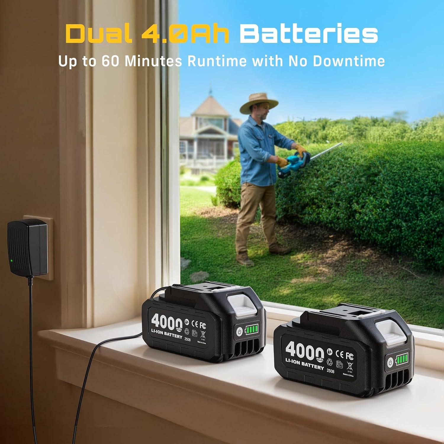 Dual 4.0Ah Batteries for Longer Use: This trimmer and blower combo includes two 4.0Ah batteries, delivering 1–2 hours of hedge trimming and reliable power for blower work around garden beds, walkways, porches, and other outdoor areas without frequent recharging