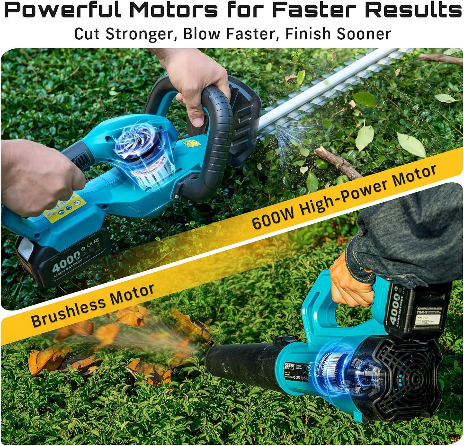 SEESII Cordless Hedge Trimmer and Leaf Blower Combo, 2 Pcs 4.0Ah Batteries, Electric Handheld Bush Trimmer with 20" Dual-Action Blade, Lightweight Brushless Blower with 2 Speed Modes for Yard Garden