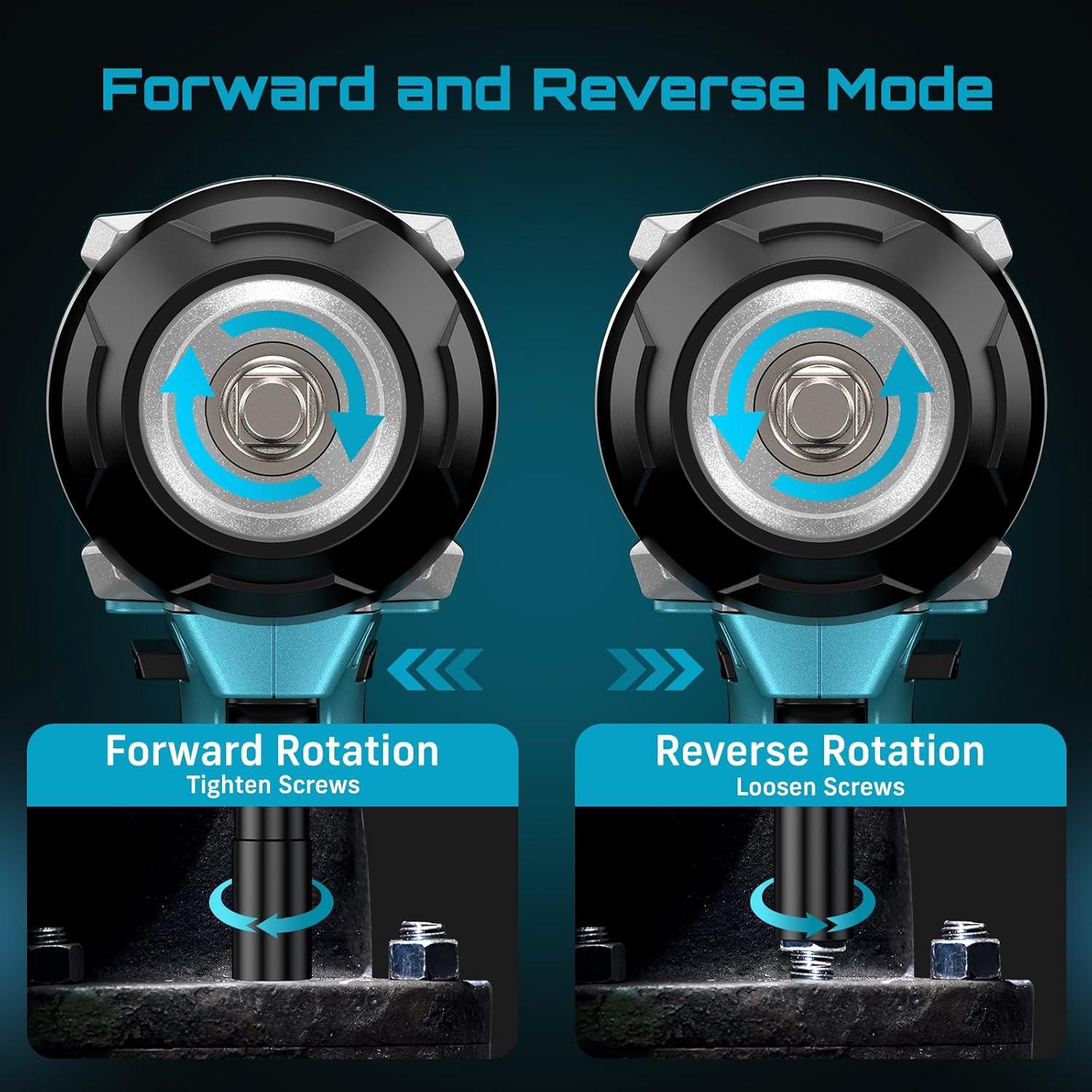 TWO DIRECTIONS & BRAKE-STOP: This impact wrench can cooperate with locking protection, forward and reverse Mode. In reverse mode, once the nut or bolt is loosened, the brake stop device will activate and reduce speed and torque to protect the nut from flying into nowhere to catch.