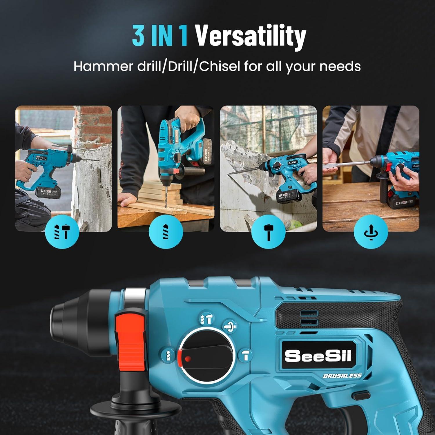 [High-Efficiency Hammer Drill]: SEESII rotary hammer drill delivers ‌2.1J impact energy‌, with a ‌no-load speed of 0–1,500 RPM‌ and a ‌MAX impact rate of 4,700 BPM‌, making it ideal for ‌heavy-duty concrete/masonry applications. This hammer drill ensures ‌efficient drilling and chiseling‌ in ‌concrete, brick, wood, metal, and stone‌, A perfect assistant for DIY hobbyists and ambitious renovation projects.
