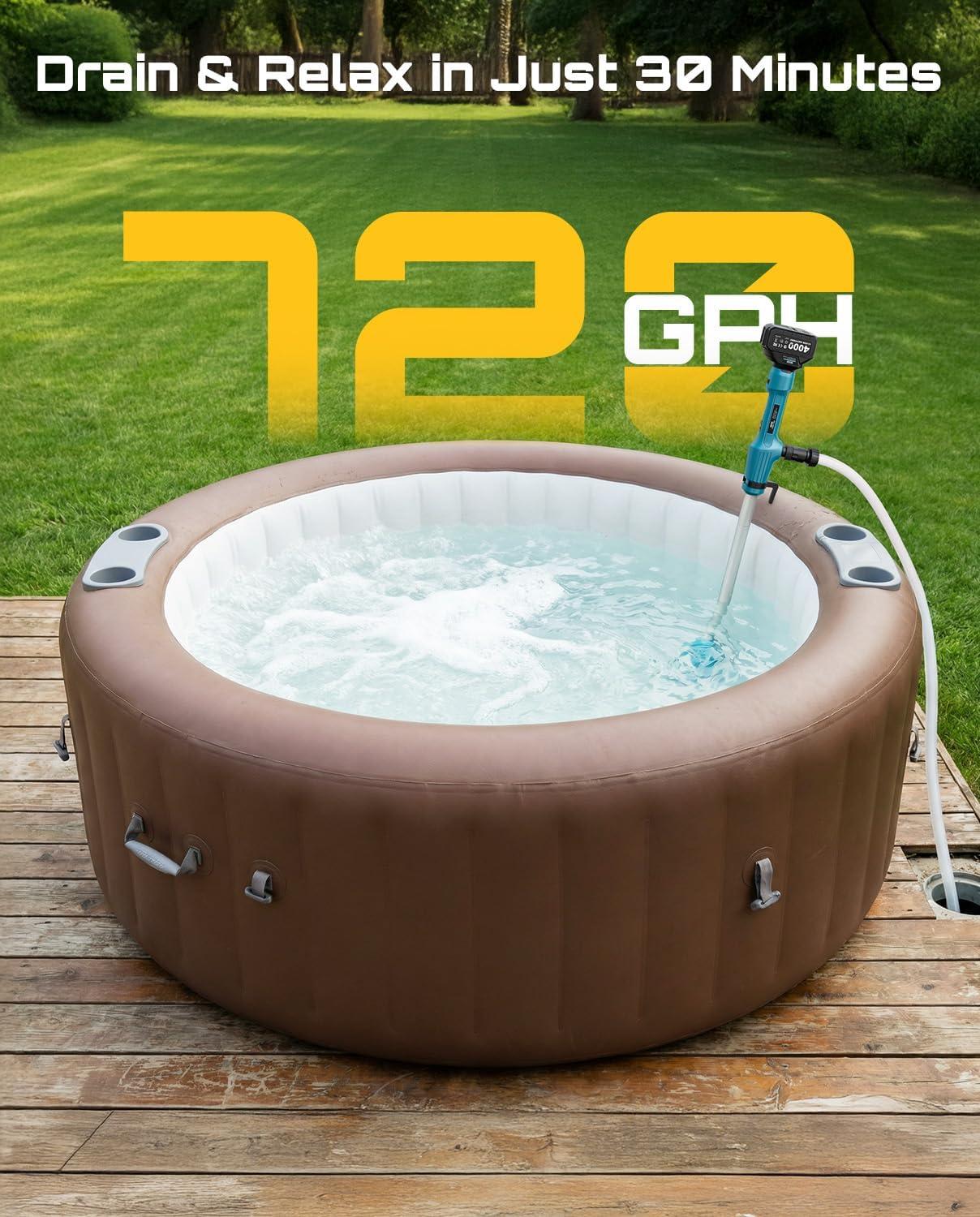 Powerful 720GPH Flow & 16FT Lift for Complete Drainage – The Fast Water Pump for Pool Draining & More: Stop waiting for water to drain. This hot tub drain pump excels at emptying above-ground pools, hot tubs, and large rain barrels quickly. The strong 720 GPH flow rapidly removes water, while the 16-foot lift efficiently tackles the last inch in pools or pumps from basement window wells. Get back to enjoying your space faster.