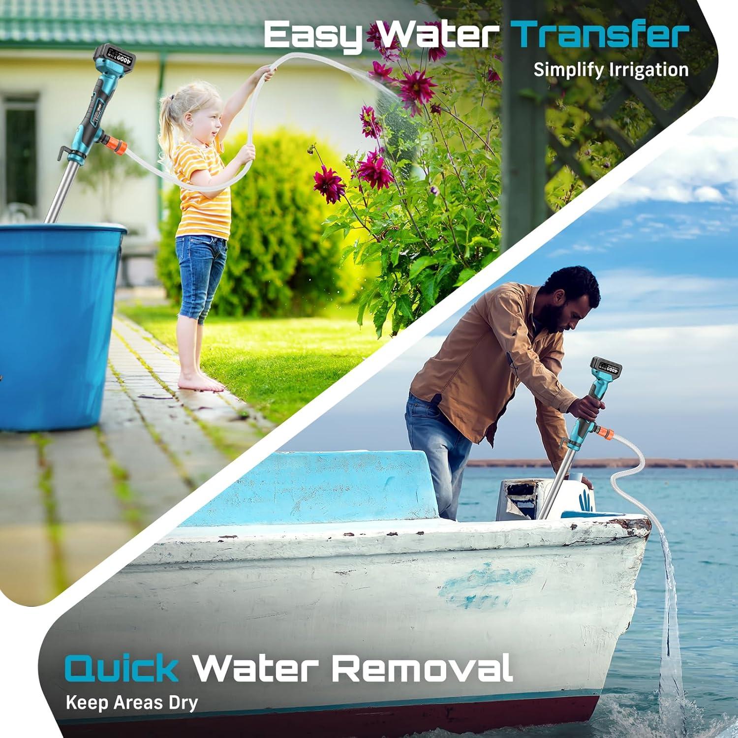Powerful High-Speed Motor for Rapid Water Transfer: SEESII battery powered water pump features a high-speed motor that operates at up to 12,500 RPM, delivering a remarkable flow rate of 720 GPH (12 GPM). With its impressive 32-foot Max lift, this water pump is capable of quickly moving large volumes of water, making it ideal for urgent drainage tasks. Whether you need to move water from deep pools, flooded areas, or garden ponds, this pump ensures fast, efficient, and reliable performance 21V High-Capacity Battery for Extended Use: This water pump comes equipped with a powerful 4000mAh 21V battery, allowing you to operate it for up to 45 minutes on a single charge. This extended runtime ensures that you can complete your water transfer tasks efficiently without the need for frequent recharging. The included charger makes it convenient to keep the pump ready for use at all times. Whether draining, watering, or handling floods, the long-lasting battery ensures reliable power Bottom Suction with Advanced Filtration System: The innovative bottom suction design of this cordless water transfer pump guarantees optimal performance, allowing the pump to efficiently draw water even from low levels. Paired with an advanced filtration system, it captures debris like sludge, weeds, leaves.This design prevents clogs, ensuring smooth operation and longer pump life.This pump efficiently drains pools, gardens, or ponds, handling dirty water with high flow and consistency Cordless Mobility for Ultimate Convenience: SEESII sump pump combines cordless mobility with a unique stick design, offering unmatched convenience at just 7.0 lbs.It's easy to move and use anywhere, whether you're draining a pool, garden pond, or flooded yard.No power cords or outlets are needed, allowing easy transport wherever it's required.This lightweight and compact pump ensures hassle-free operation, giving you the freedom to tackle water removal tasks anytime, anywhere Overcurrent Protection for Safe Operation: SEESII cordless stick water transfer pump is equipped with advanced overcurrent protection to ensure worry-free use. If the base is lifted out of the water, the hose becomes bent or obstructed, or the bottom filter gets clogged with debris like grass or mud, the indicator light will illuminate, and the pump will automatically shut off within seconds. This safeguard prevents motor damage and extends pump life, ensuring worry-free operation Versatile and Multi-Purpose Utility: Our cordless water transfer pumps handles a wide range of tasks. It effortlessly waters plants, refills ponds, and drains water features in gardens. For home use, it’s perfect for draining washing machines, aquariums, or clogged sinks. In emergencies, it swiftly removes water from minor floods or leaks. Ideal for recreational activities, it drains water from boats, kayaks, and watercrafts. Plus, it's a versatile tool for DIY projects requiring water transfer 38″ Aluminum Submersible Barrel with 3/4″ Outlet: This portable power battery pump is equipped with a 38″ submersible aluminum barrel, designed to efficiently draw water from deeper sources like ponds, pools, or flooded areas. The durable aluminum construction ensures long-lasting performance while resisting corrosion, making it ideal for extended use. With its 3/4″ outlet, the pump easily connects to standard garden hoses, allowing for quick and hassle-free water transfer 3-Year Warranty & 24/7 Customer Support: SEESII small water pump comes with a 3-year warranty and lifetime technical support, ensuring peace of mind for our customers. Our dedicated customer service team is available 24/7 to assist you with any questions or issues you may encounter. We’re here to provide expert support, whether for installation or troubleshooting.With SeeSii, you get a high-quality product and reliable after-sales service to keep your pump running smoothly Note: Before use, please ensure that pool pump is placed vertically into the water and the switch is pressed fully to the top position