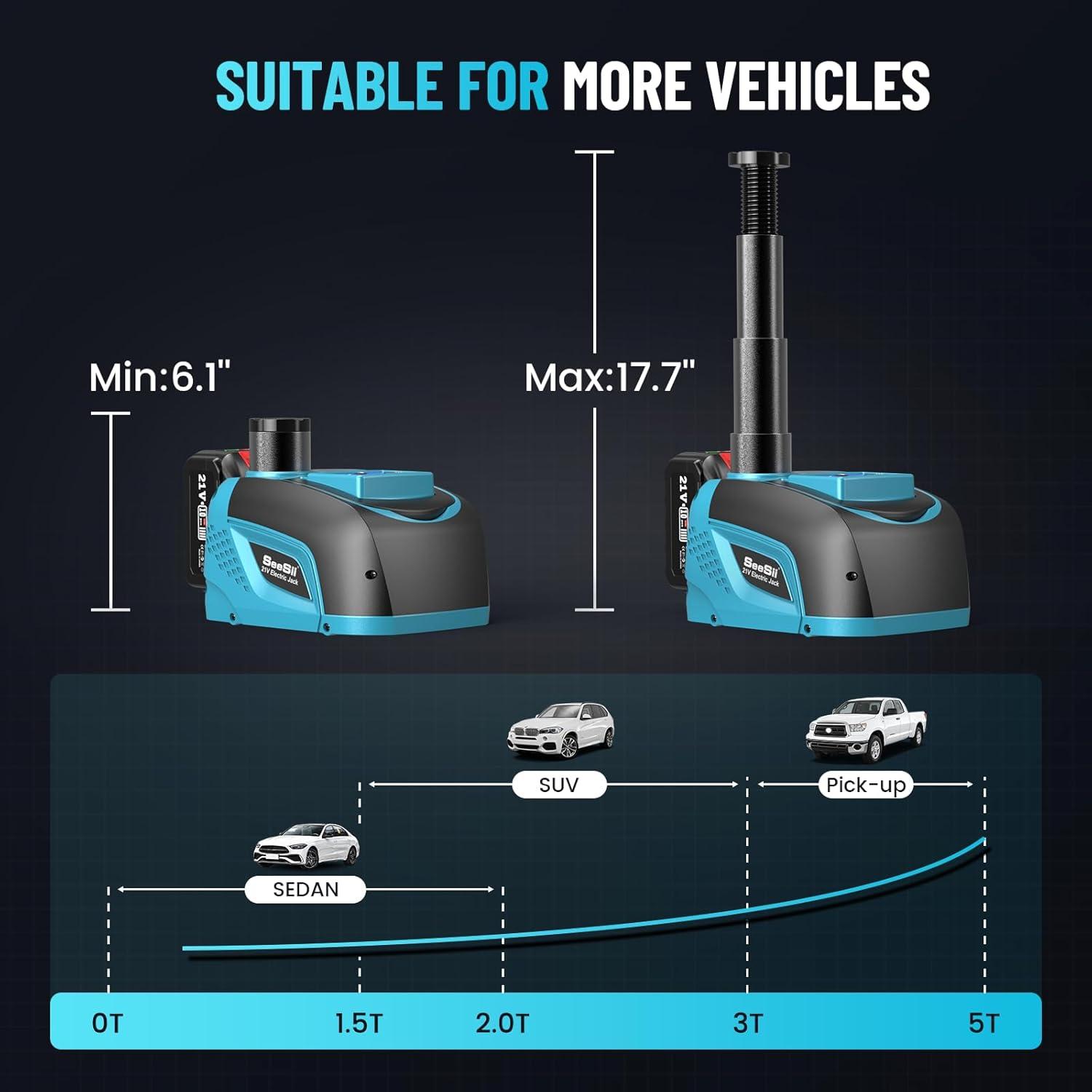 【Fits Most Vehicles】With a 5-ton (11,000 lbs) lifting capacity and a 6.1-17.7 inch lifting range, this electric car jack is compatible with sedans, SUVs, and trucks. It’s engineered to provide stable and secure lifting for various vehicle sizes, ensuring a smooth and safe tire change. Whether you drive a small car (under 3 tons) or a large vehicle, this hydraulic jack has you covered