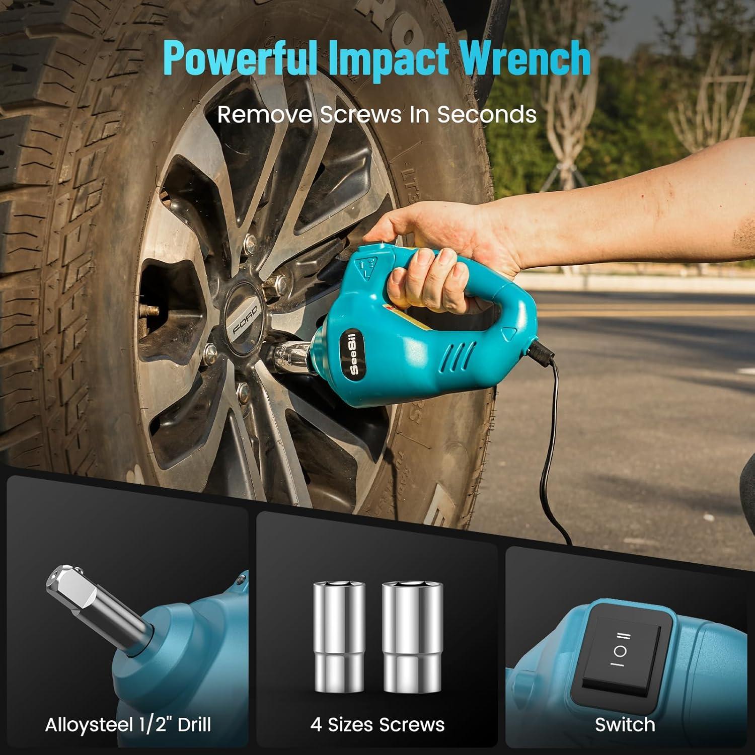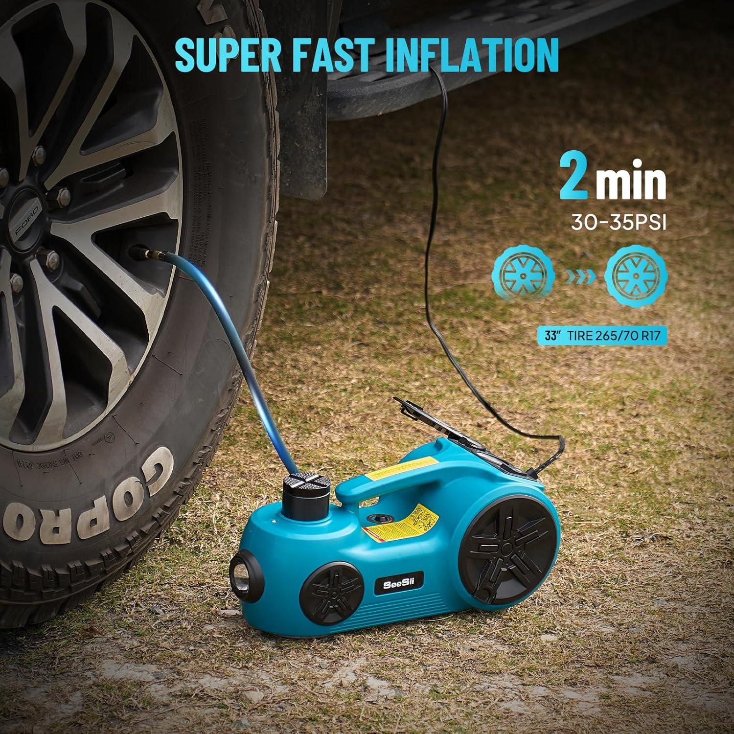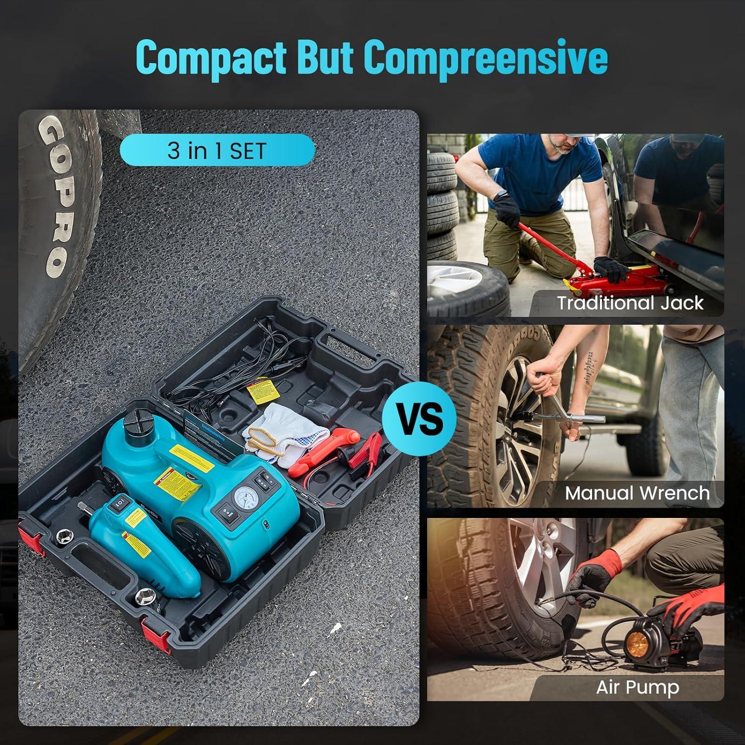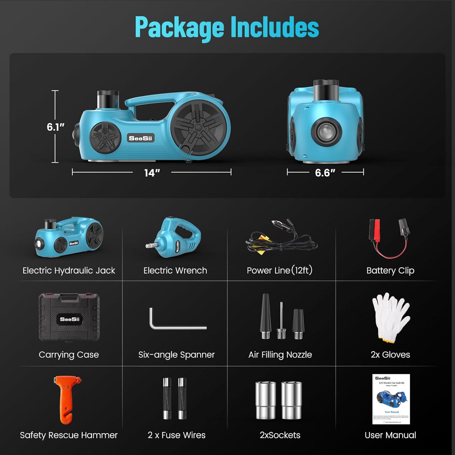 Complete 3 in 1 Car Jack Kit: Experience the ultimate convenience with SEESII electric hydraulic jack, featuring an electric impact wrench and tire inflator pump. This comprehensive car jack kit allows you to handle tire replacements effortlessly within minutes, eliminating the struggle of traditional manual jacks. Save time and energy on roadside emergencies or regular maintenance