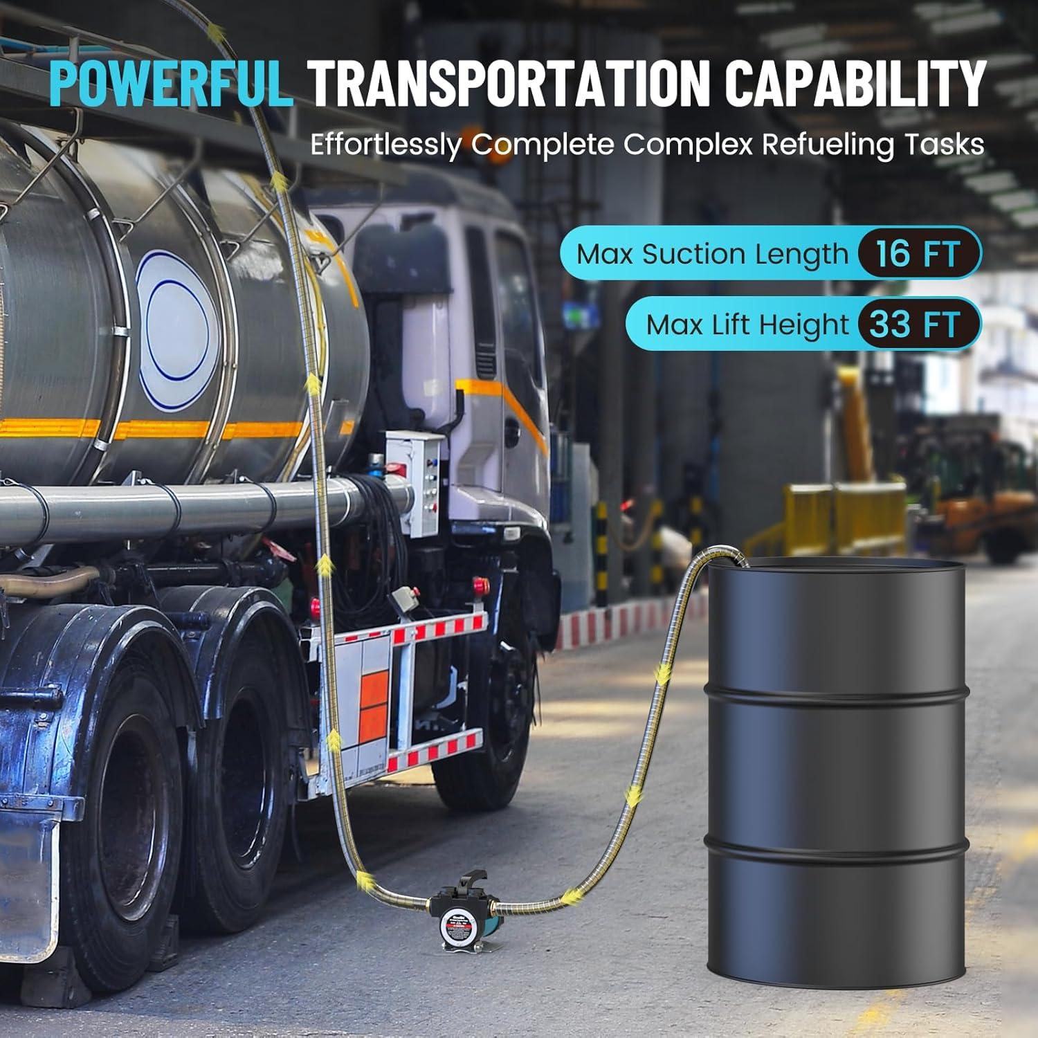 Impressive Suction & Lift Capacity: This portable 12V fuel transfer pump can draw fuel from up to 16 feet away and pump it to heights of up to 33 feet. The diesel pump easily handles long-distance refueling and high-position fuel tanks, making it perfect for agricultural machinery, boats, RVs, and various other applications