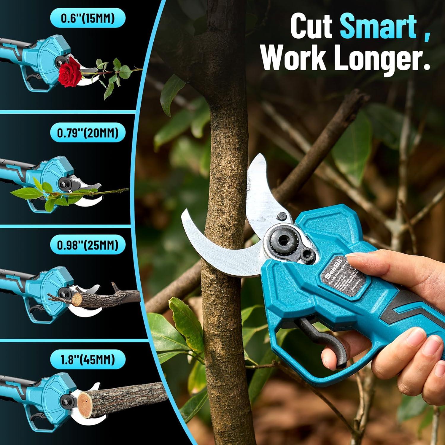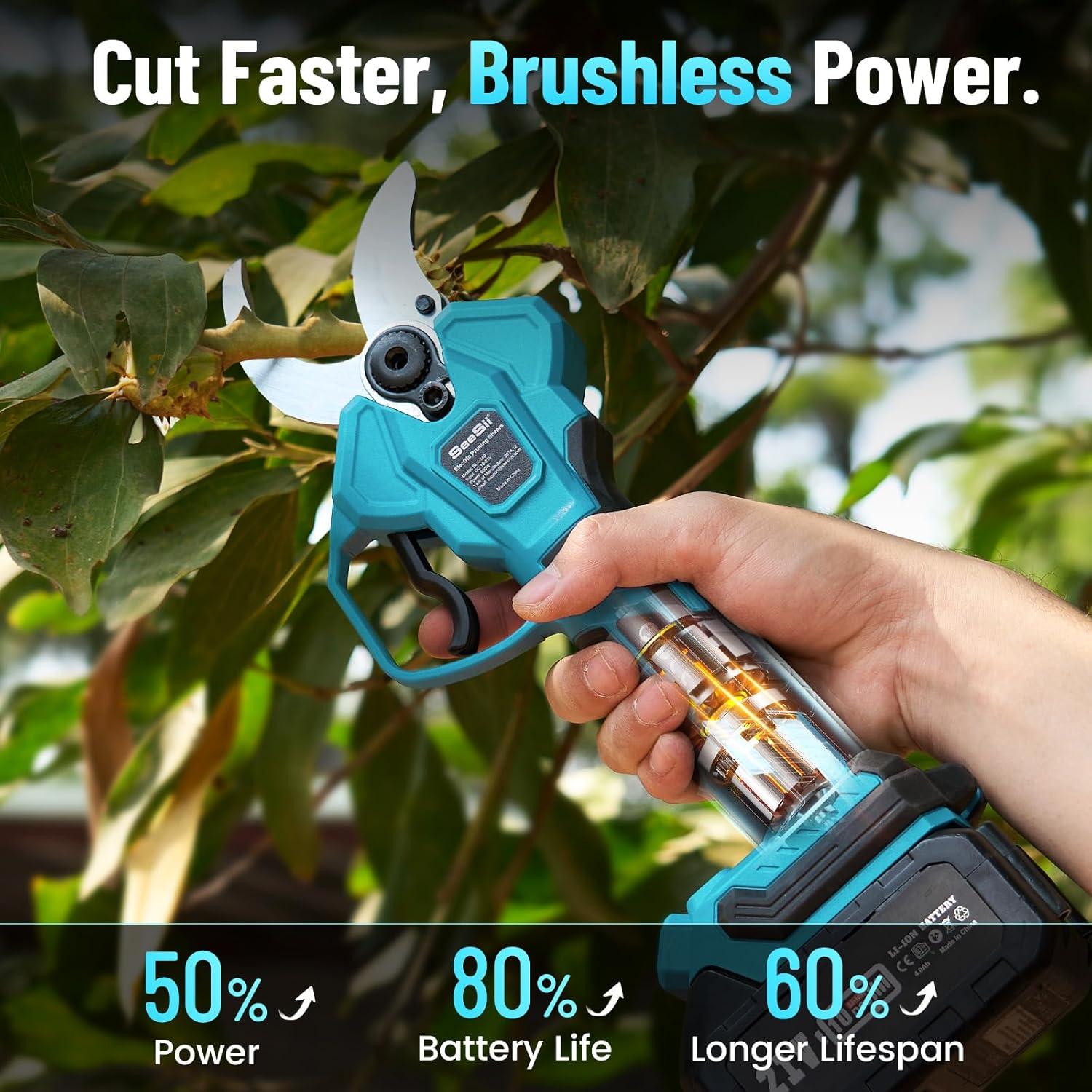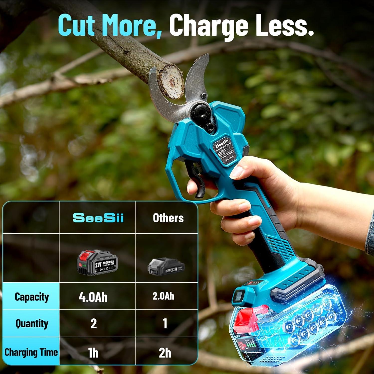 Seesii Electric Pruning Shears for Gardening: 1.8” Cutting Cordless Power Pruner - Brushless Motor, Dual 4.0Ah Battery+Seesii Mini Chainsaw Cordless 6-inch