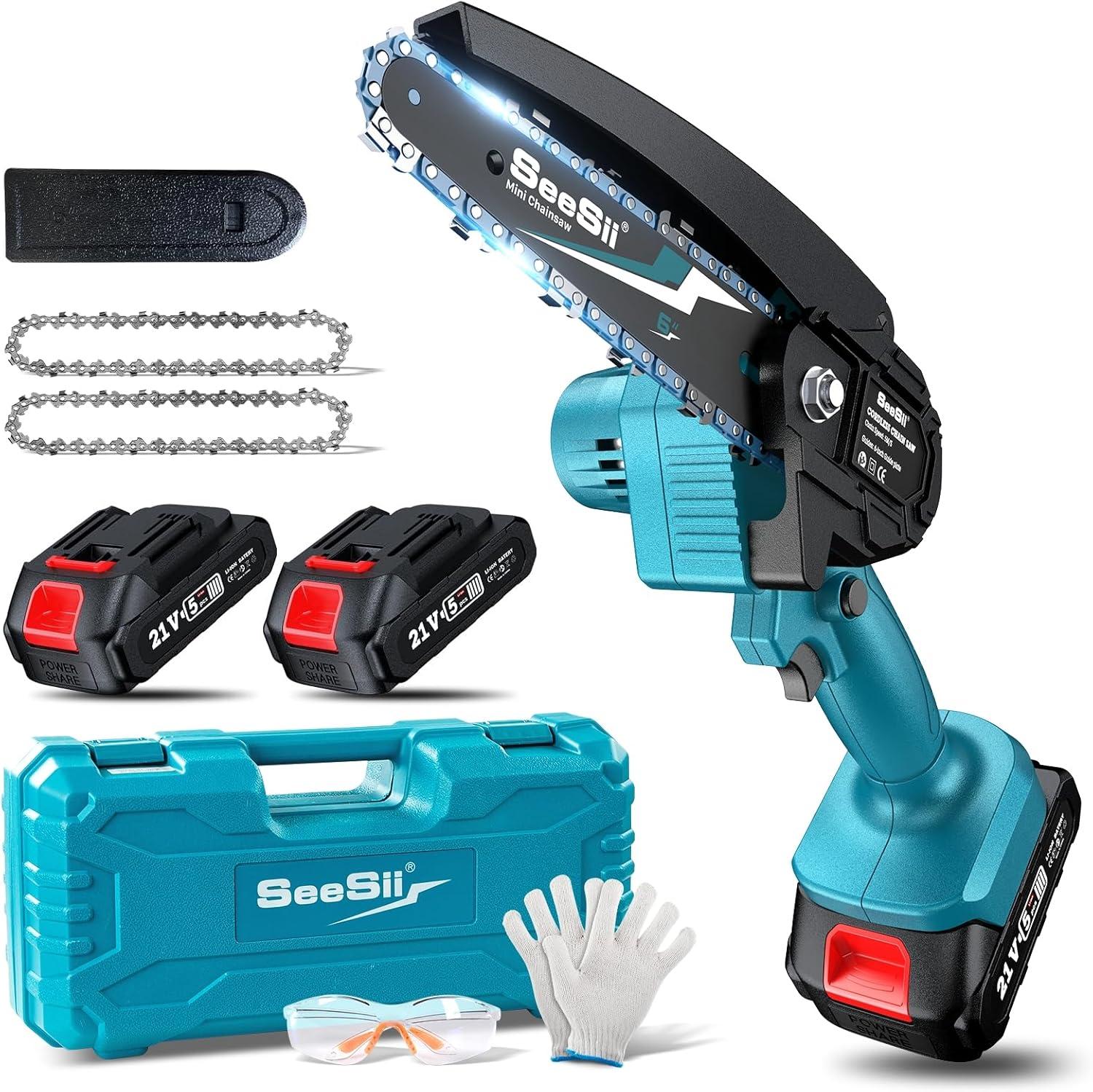 Seesii Electric Pruning Shears for Gardening: 1.8” Cutting Cordless Power Pruner – Brushless Motor, Dual 4.0Ah Battery+Seesii Mini Chainsaw Cordless 6-inch