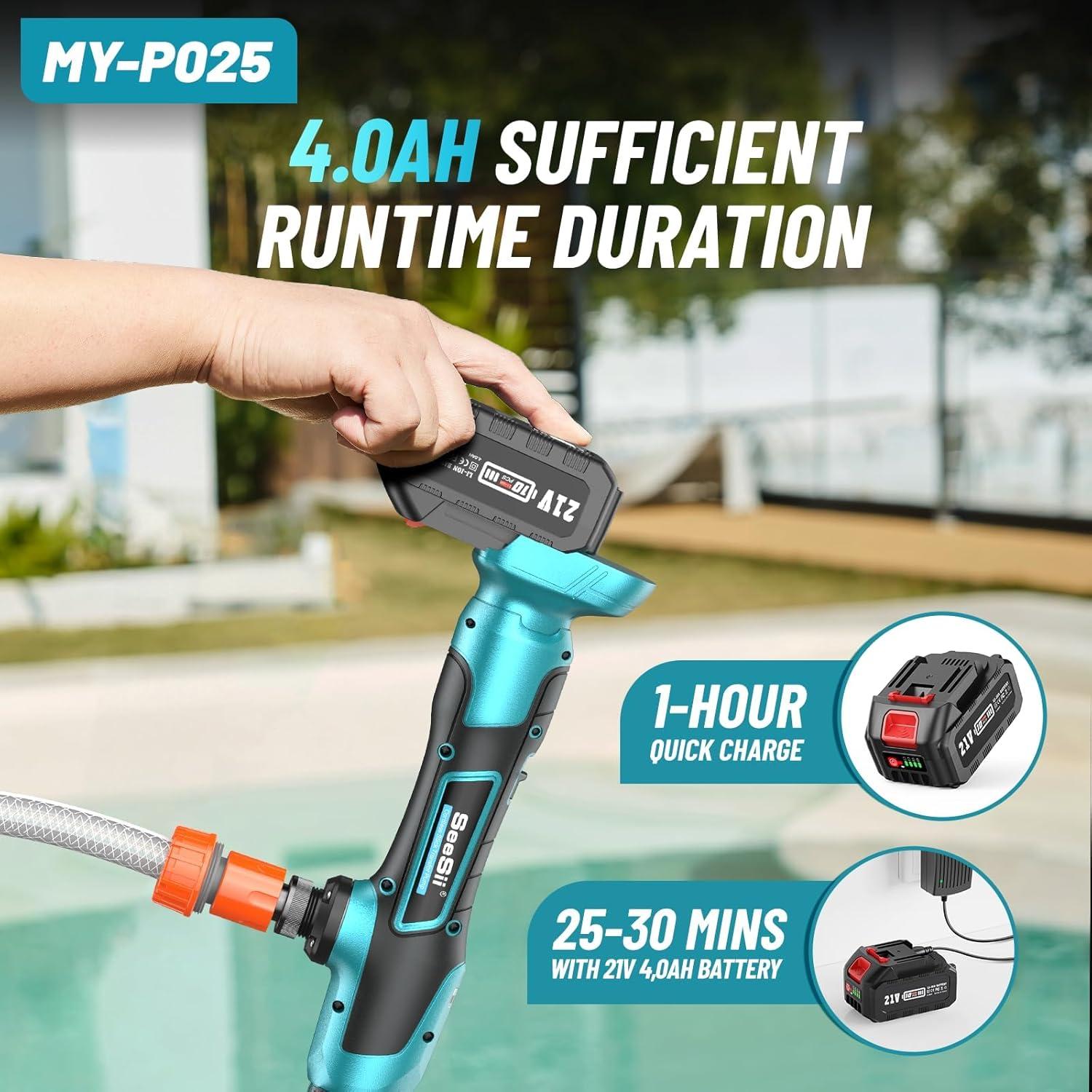 Powerful High-Speed Motor for Rapid Water Transfer: SEESII battery powered water pump features a high-speed motor that operates at up to 12,500 RPM, delivering a remarkable flow rate of 720 GPH (12 GPM). With its impressive 32-foot Max lift, this water pump is capable of quickly moving large volumes of water, making it ideal for urgent drainage tasks. Whether you need to move water from deep pools, flooded areas, or garden ponds, this pump ensures fast, efficient, and reliable performance
