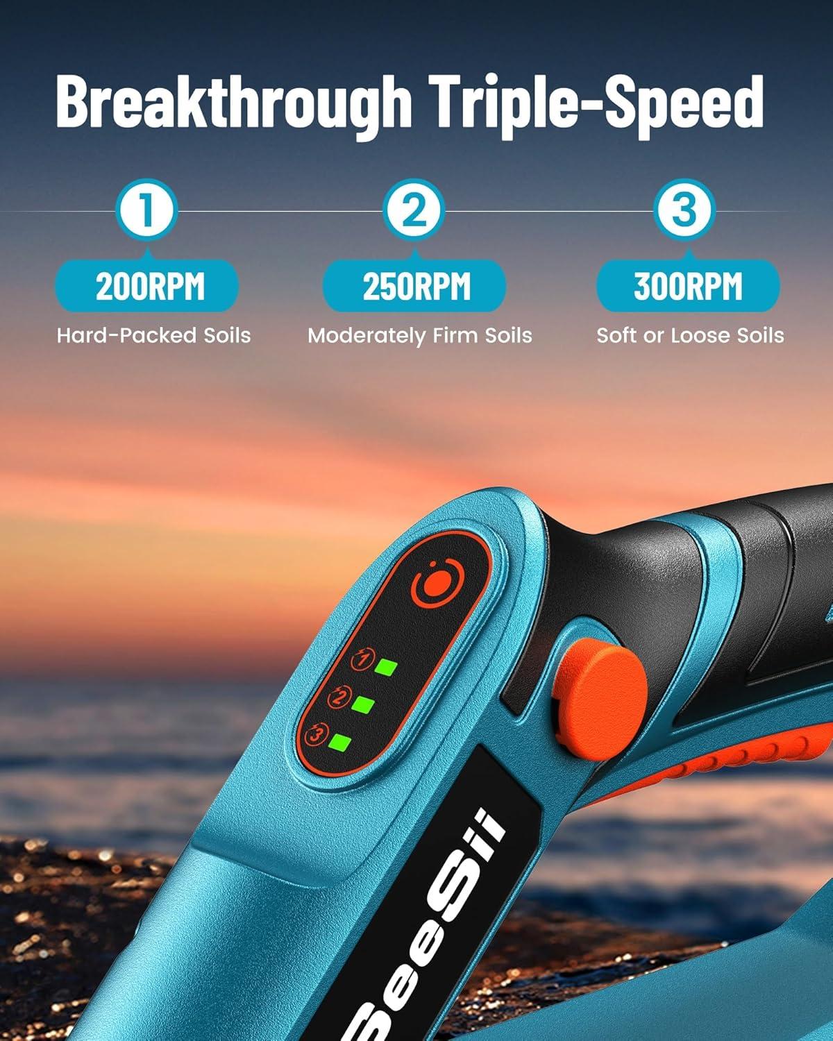 Innovative 200 / 250 / 300 RPM: With three expertly engineered speed settings, this tiller adapts seamlessly to diverse soil conditions, ensuring maximum productivity and superior results. Whether you're tackling tough, compacted ground or working on softer terrain, this machine offers the versatility and performance you need to get the job done right. Elevate your soil preparation with unmatched efficiency and precision