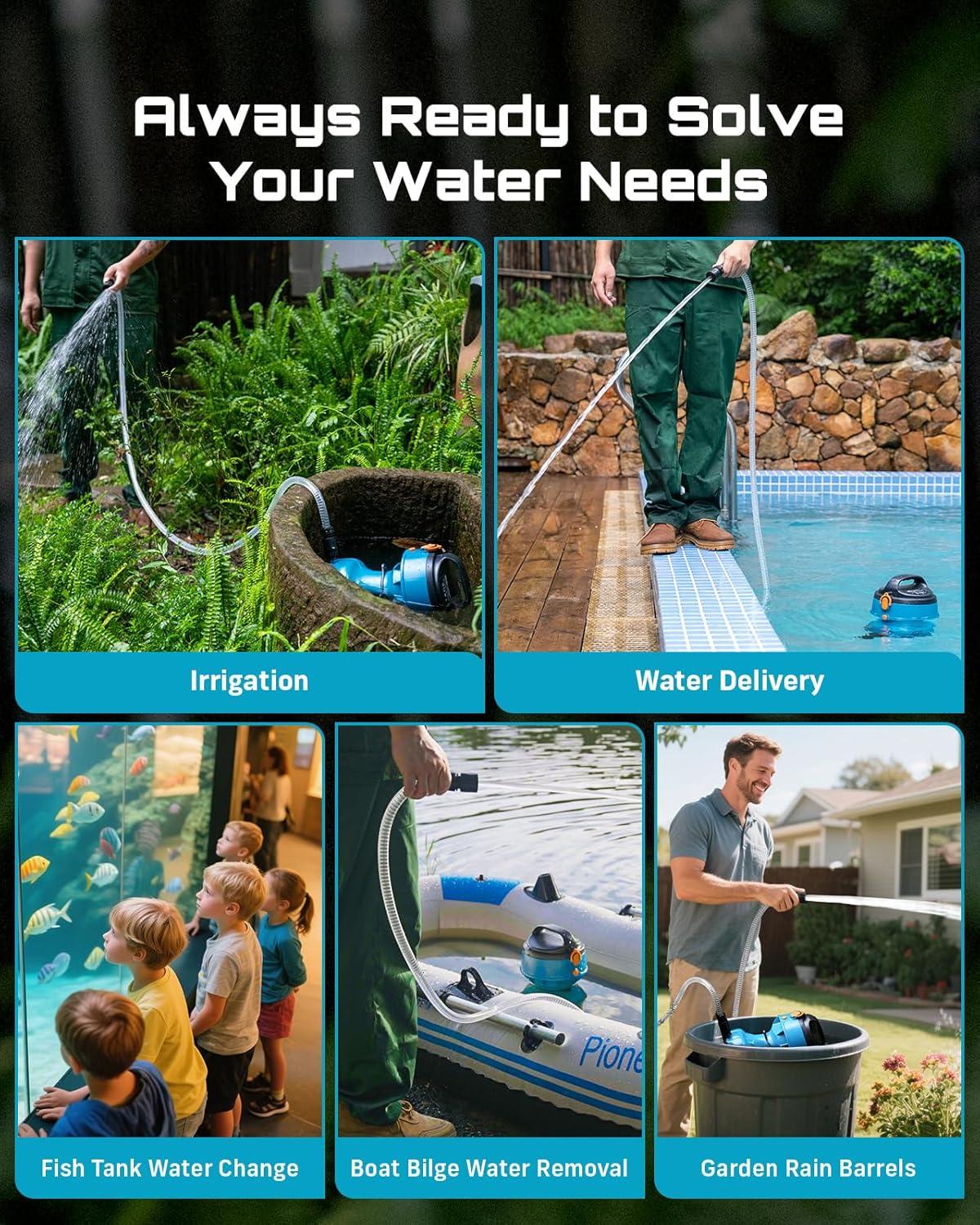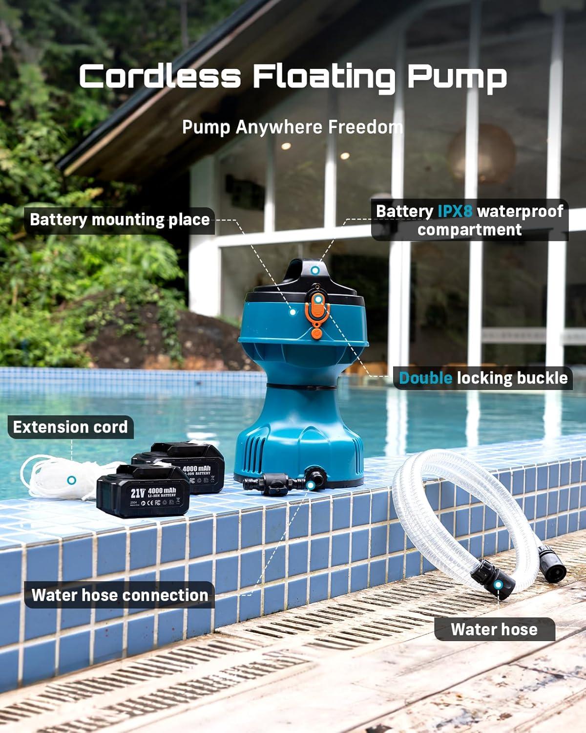 IPX8 Waterproof, Peace of Mind: The SEESII small water pump features an IPX8 waterproof battery cover and fully sealed structure for comprehensive waterproof performance. Its floating design easily handles scenarios such as heavy rain, pond cleaning, and flood drainage, while the protective battery compartment design ensures the pump can operate safely in humid environments