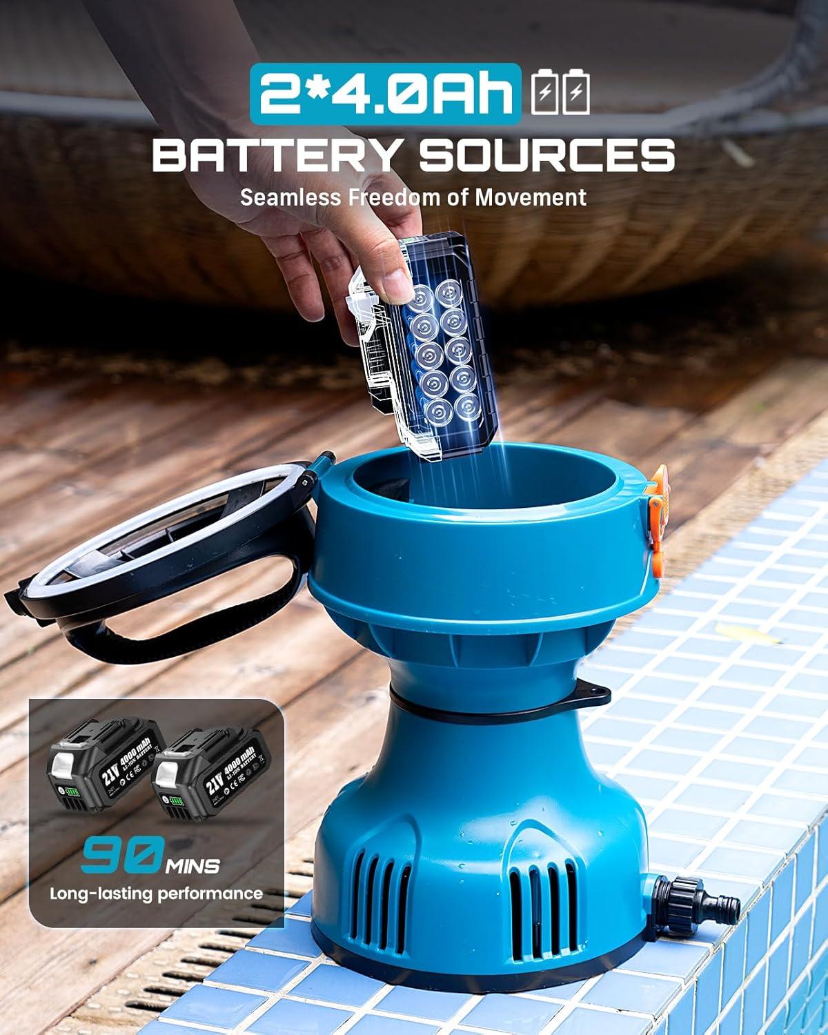 Dual Battery for 2 Hours Runtime: SEESII cordless transfer pump comes with two 21V 4000 mAh batteries for plug-and-play operation—just insert and start pumping. Designed for strong, continuous drainage in pond cleaning, flood control, or pool maintenance, the dual-battery system provides 2 hours of runtime—200% longer than single-battery pumps. Swap batteries seamlessly for uninterrupted operation
