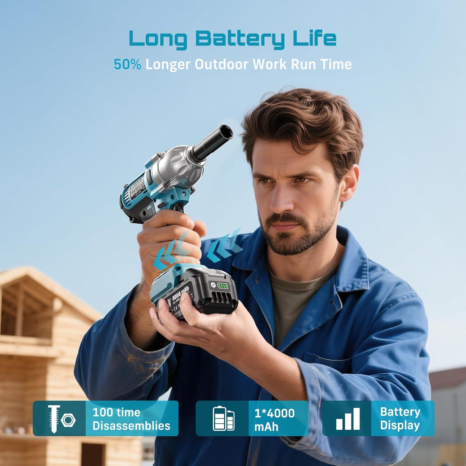High-Efficiency Battery System: SEESII impact wrench set includes one 21V/4.0Ah lithium battery with 200% extended runtime for non-stop work. The 30-minute quick charge (up to 80%) means minimal downtime, while the 3-LED power indicator keeps you informed. The Seesii impact wrench perfect for professionals needing reliable all-day power!
