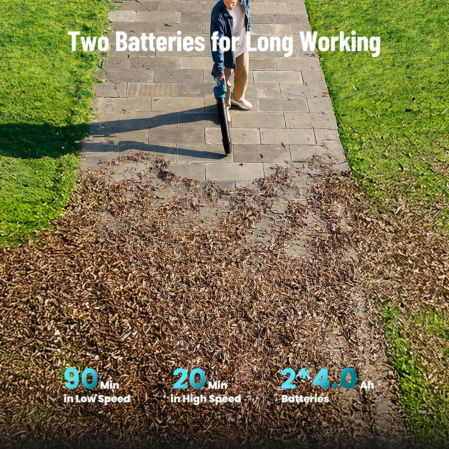 Long-Runtime with 2×4.0Ah Batteries: Never stop mid-task. Powered by two 21V 4.0Ah batteries, this leaf blower cordless with battery and charger provides up to 90 minutes of continuous runtime at low speed and 20 minutes at high. The included batteries and charger ensure you have the power to finish the job without frequent, inconvenient charging breaks.
