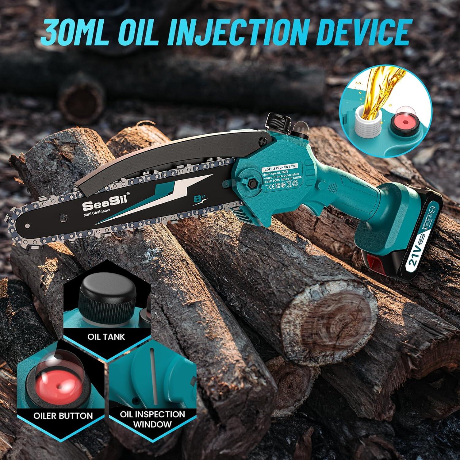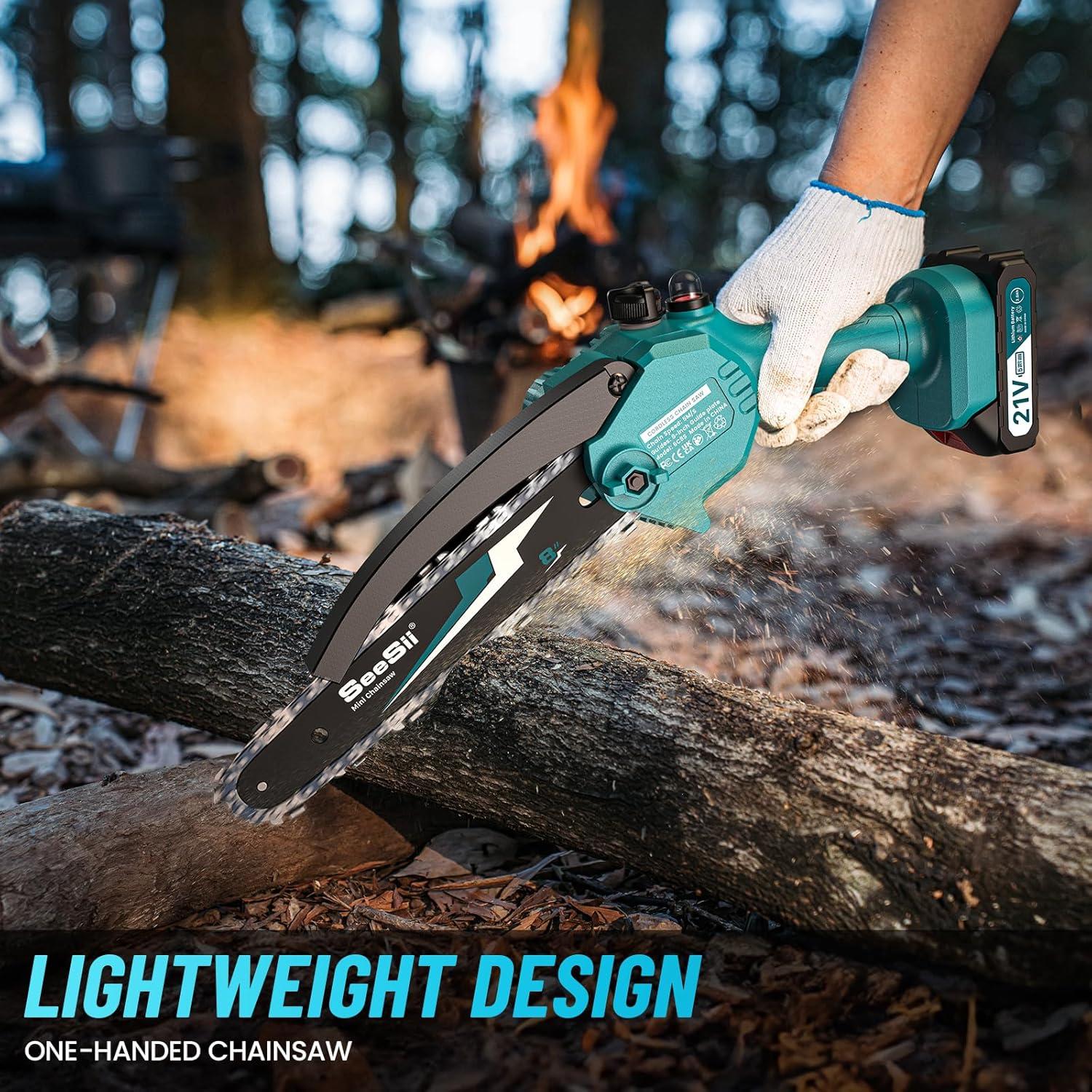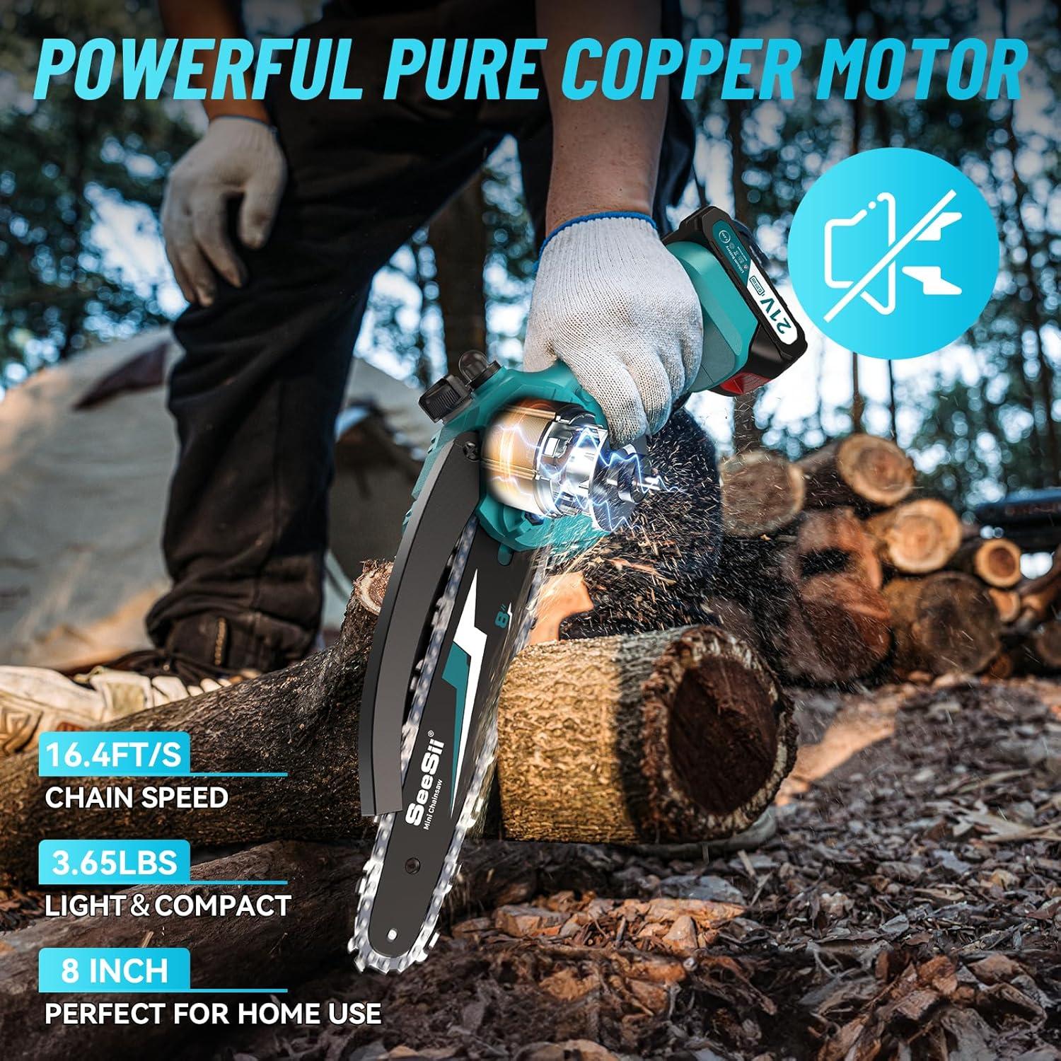 【EFFICIENT CUTTING】Seesii's mini chainsaw, with its powerful motor and dual batteries, effortlessly slices through 5.91-inch logs in just 8 seconds. Perfect for wood cutting, pruning, and gardening, it offers unmatched portability and speed compared to traditional chainsaws