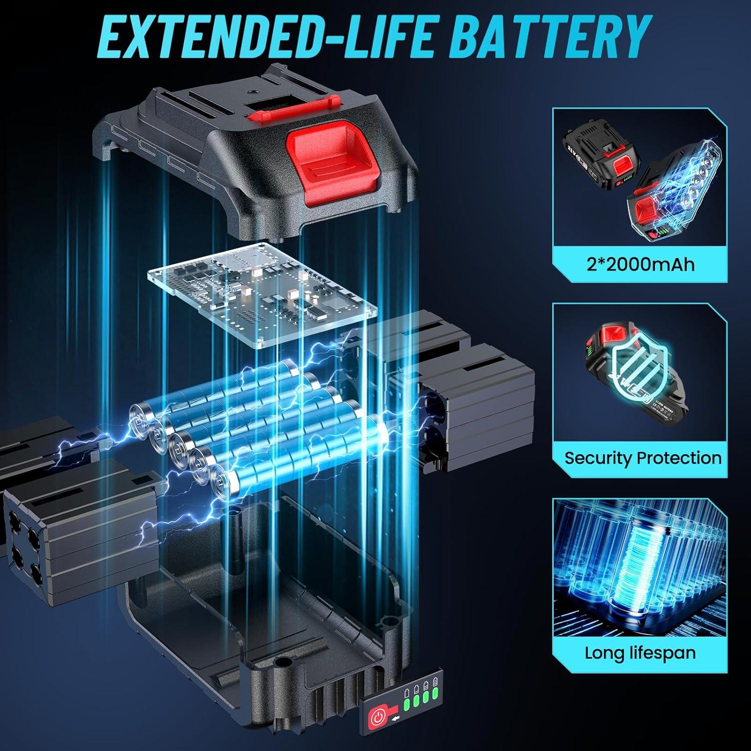 【LARGE CAPACITY BATTERY PACK】Our mini cordless chainsaw comes with 2 Pack 2.0 batteries and a fast charger for extended usage. Equipped with self-overload and temperature protection, these rechargeable batteries ensure a longer lifespan