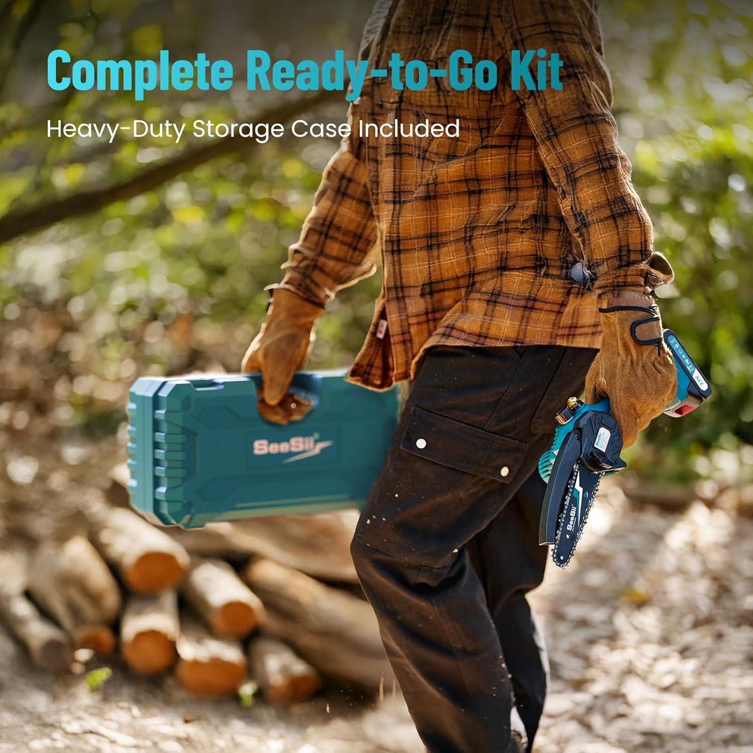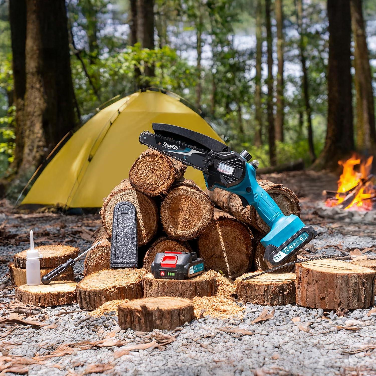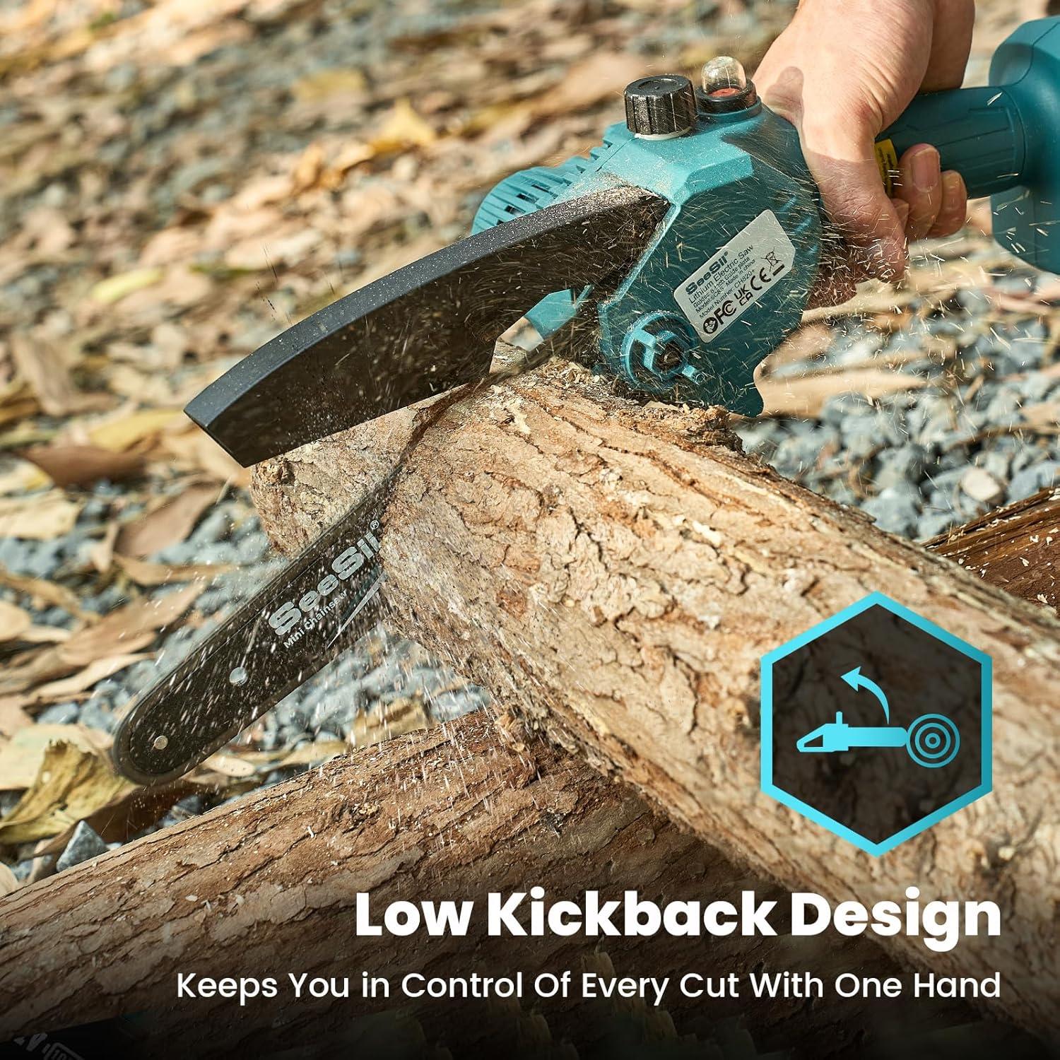 【EFFICIENT CUTTING】Seesii's mini chainsaw, with its powerful motor and dual batteries, effortlessly slices through 5.91-inch logs in just 8 seconds. Perfect for wood cutting, pruning, and gardening, it offers unmatched portability and speed compared to traditional chainsaws