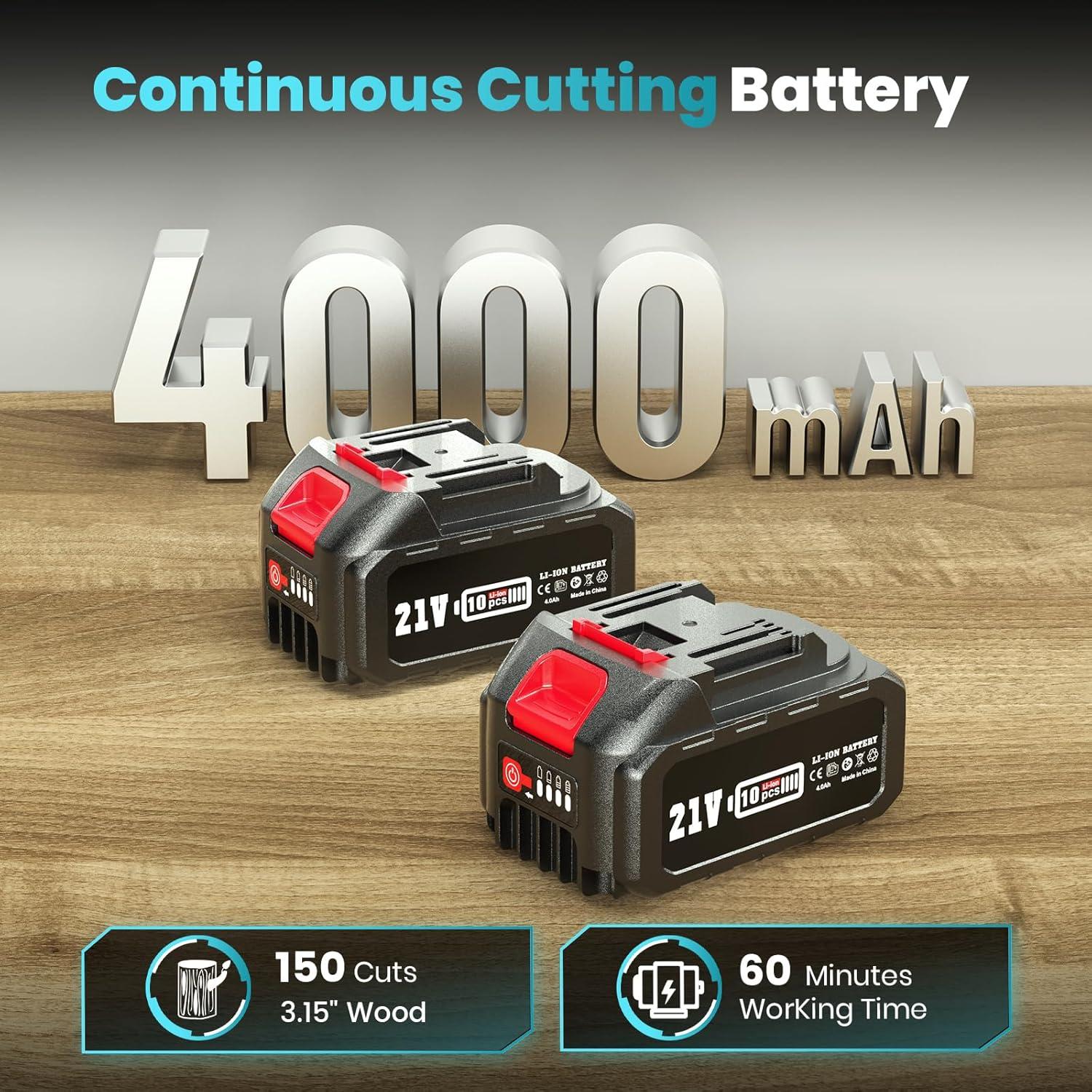 【LARGE CAPACITY BATTERY PACK】Our mini cordless chainsaw comes with 2 Pack 2.0 batteries and a fast charger for extended usage. Equipped with self-overload and temperature protection, these rechargeable batteries ensure a longer lifespan