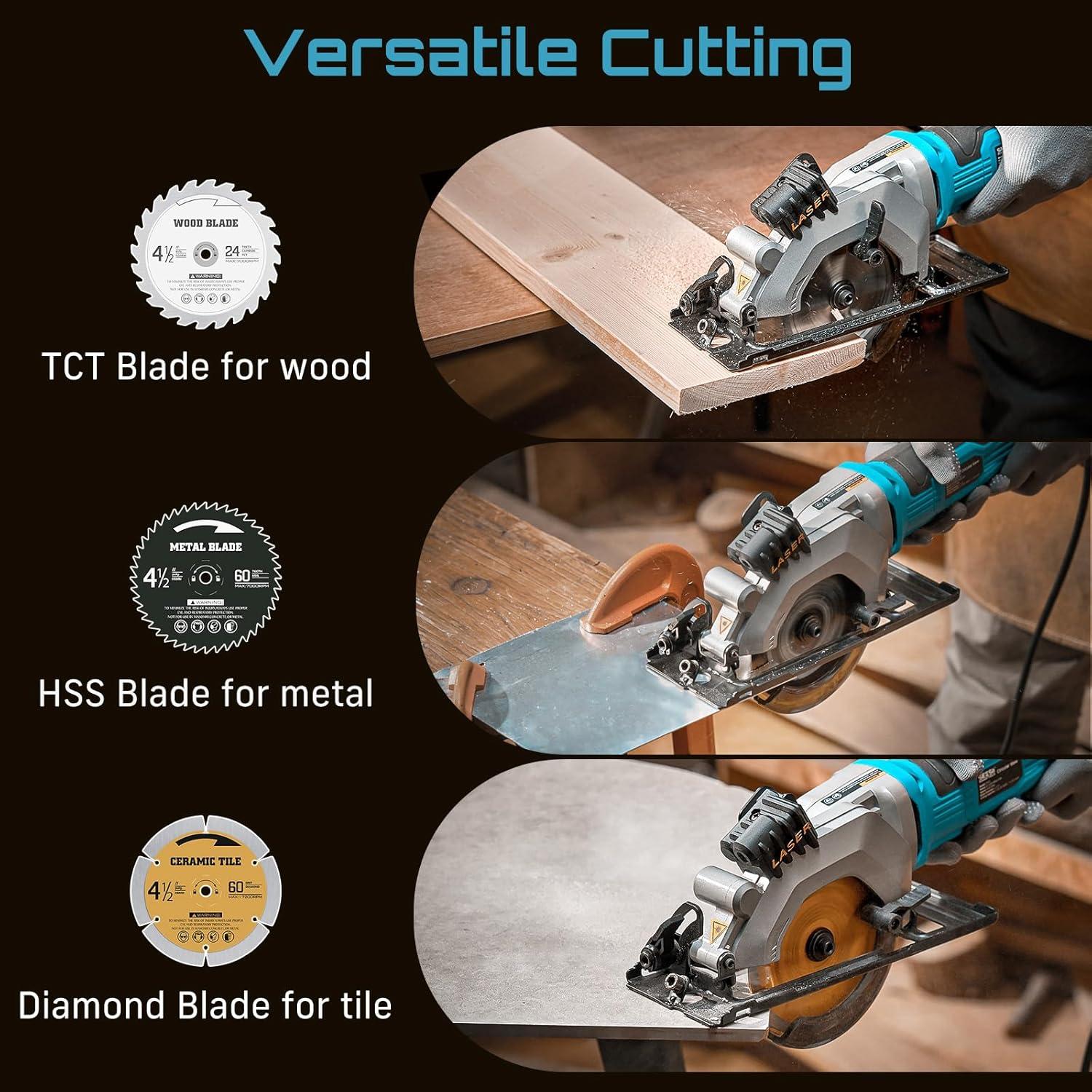 Not just for wood: Unlike standard circular saws limited to wood, the compact circular saw has 3 blades (4½”), including TCT, HSS and diamond blades. It can cut for wood, soft metal, tile, plastic, achieving multi-material versatility and making multi-material projects simpler, safer, and more efficient. Skip the hassle of buying extra blades for unlimited projects, suitable for diy and home tasks. Good choice for DIYers who refuse to be limited by their tools