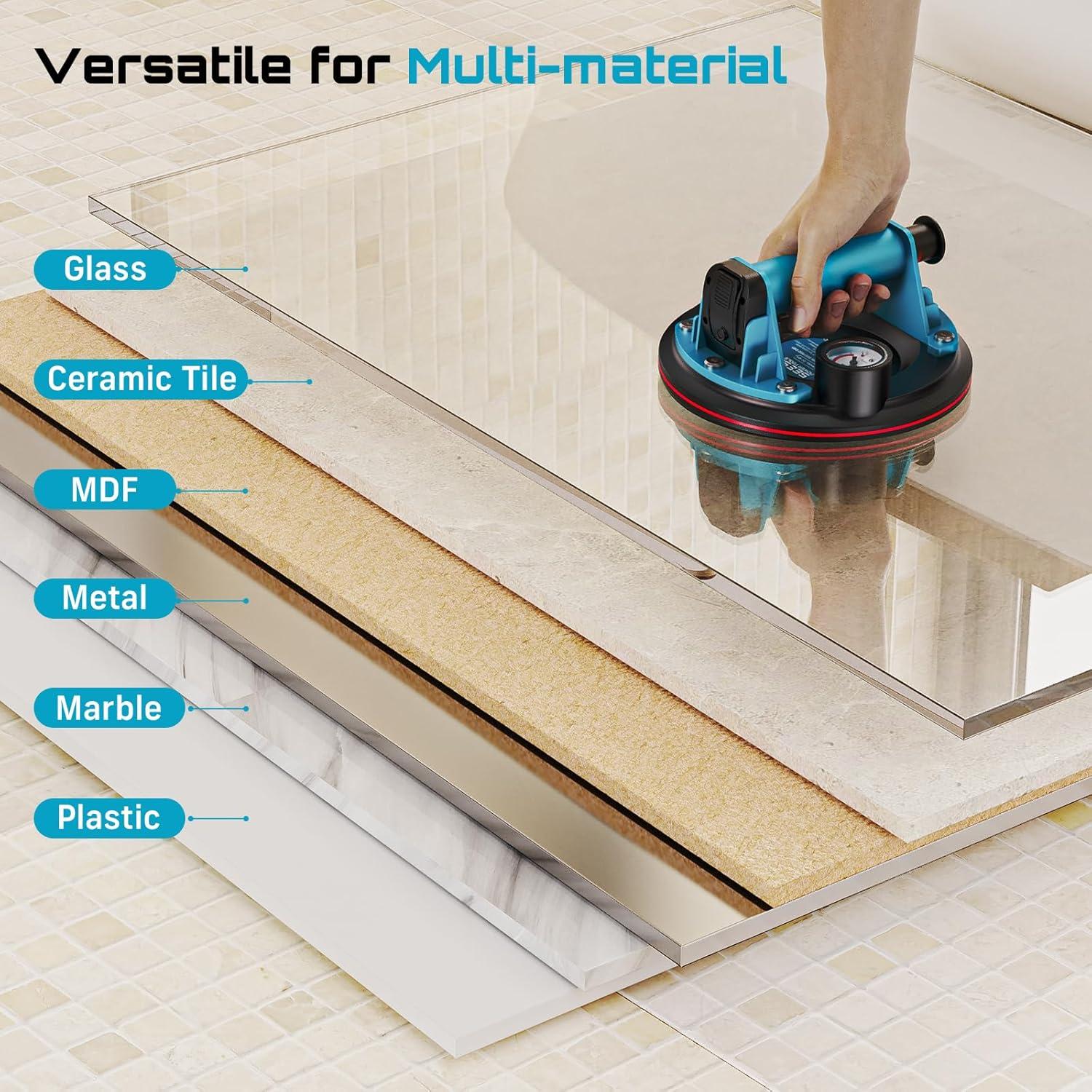 【Designed for Real Tile Jobs & Large Formats】:These tile suction tools work on smooth, non-porous surfaces like porcelain, ceramic, marble, granite, glass, and metal. Handles 12″–48″ large-format tiles with ease. (Not recommended for rough or porous surfaces.)